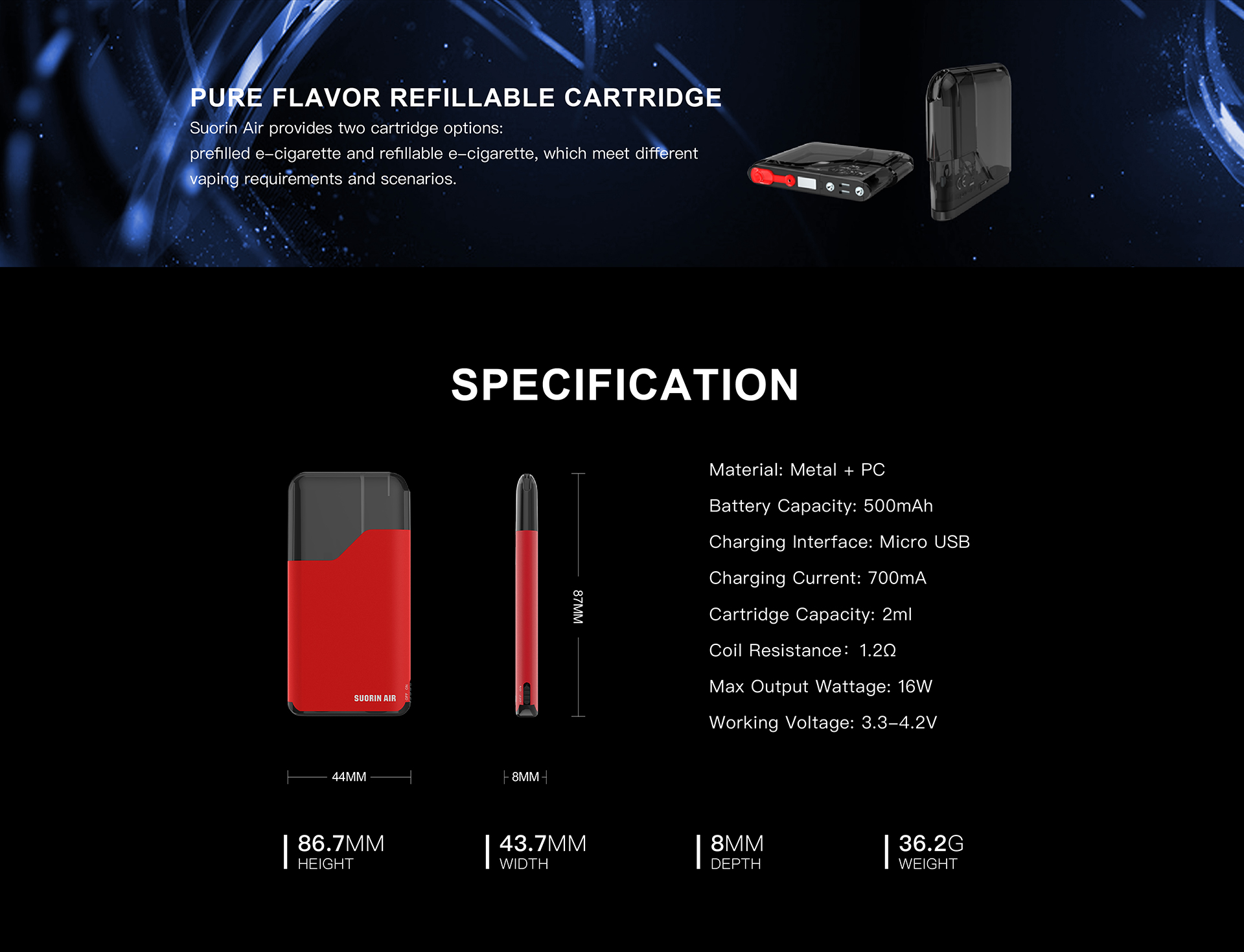Simplicity is the main attraction to the Suorin Air. This little wonder is small, not much bigger than a credit card. It’s an all in one unit that uses replacement pods. You can refill it, so it works like a regular tank would. It’s an auto draw device. The battery on this unit is 500mAh, which means that byou can expect to have to charge it. It does come with a micro USB cable for charging. It comes with a 1.2Ω coil, so you want to use a 50/50 blend with it. The Suorin Air is a good bet, if you’re looking for a good portable, on the go vape. Refilling the replacement pods are very simple to understand and keeping a few extras on hand means easy flavor changing without blending!
